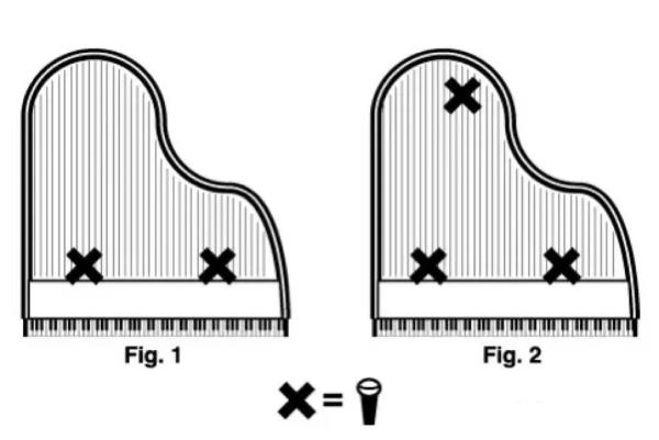 以下是在钢琴拾音中不同话筒摆放位置所带来的不同声音效果。 ① 钢琴底部拾音: 这种方法适用于捕捉到低频和共鸣效果。话筒可以放在钢琴底部或底部近处,靠近共鸣箱和琴弦。这样可以捕捉到钢琴的低音和低音共鸣的特殊效果,突出钢琴整体的花哨、温暖和厚度等特性。 ② 钢琴声板上方拾音: 在钢琴声板上方放置话筒可以捕捉到琴弦和声板的共鸣效果,获得更清晰、更明亮的声音效果。在这种情况下,话筒与声板的距离需要根据采样需求进行调整。